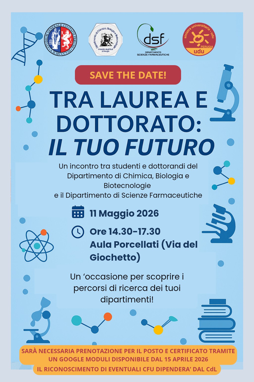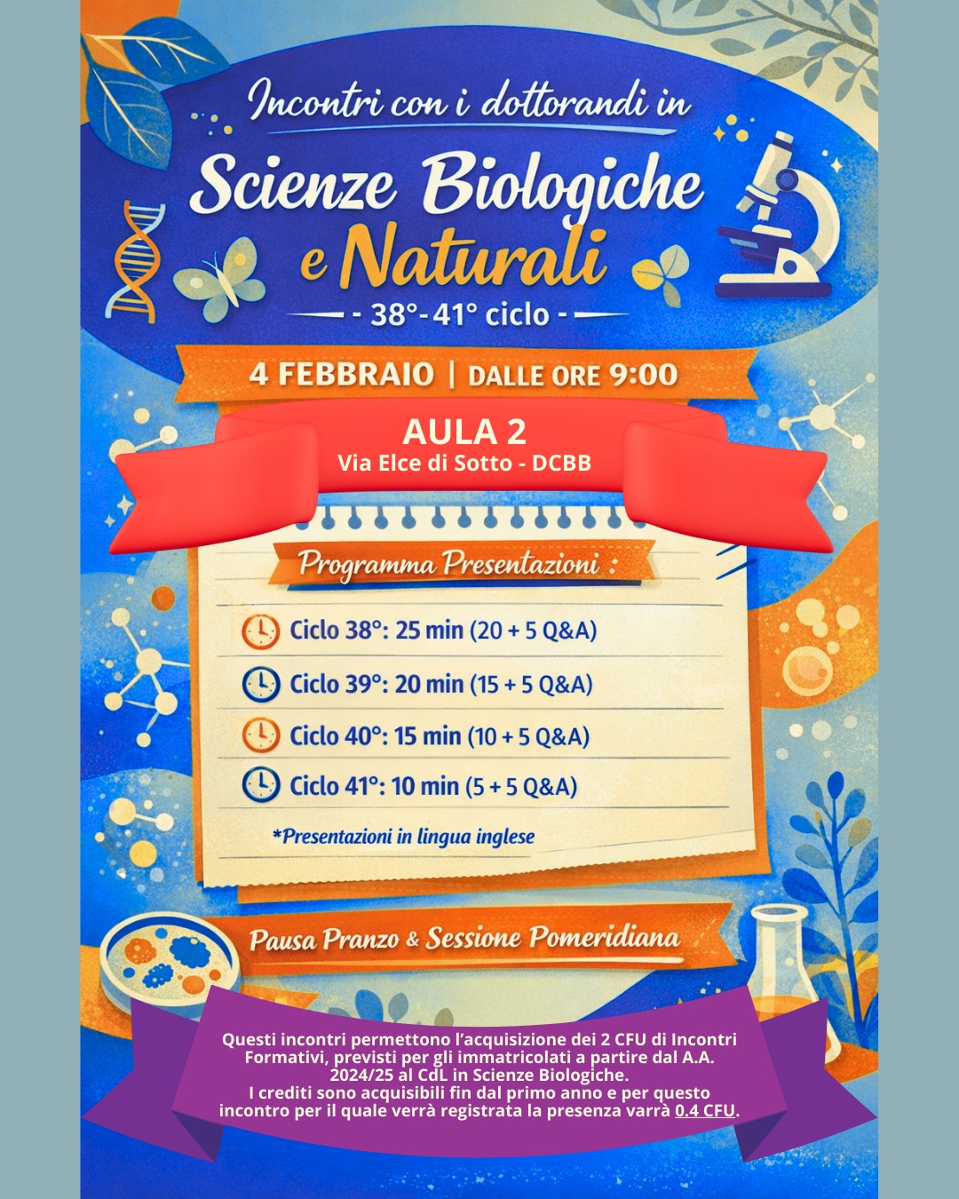 La giornata permette l'acquisizione di 0.2 dei 2 C.F.U. di Incontri Formativi, previsti per gli immatricolati a partire dal A.A. 2024/2025 al Corso di Laurea in Scienze Biologiche. In questo caso, per tale riconoscimento sarà possibile firmare la propria presenza all’ingresso della sala, dove troverete un tavolo d’accoglienza dedicato, non ci è possibile gestire l'acquisizione della presenza online.